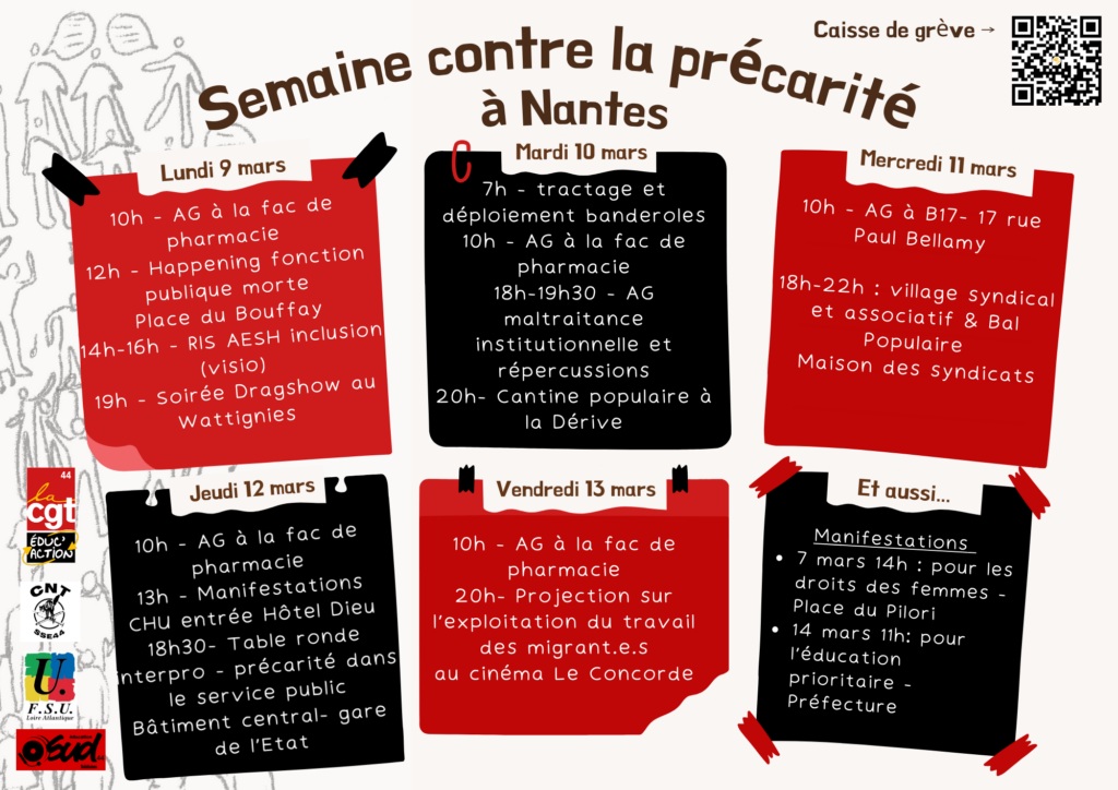 Pour un service public plus fort pour les personnels et les usagèr.es! Semaine contre la précarité organisée par l’intersyndicale à Nantes (44). Lisez le programme pour rejoindre les différents évènements proposés!