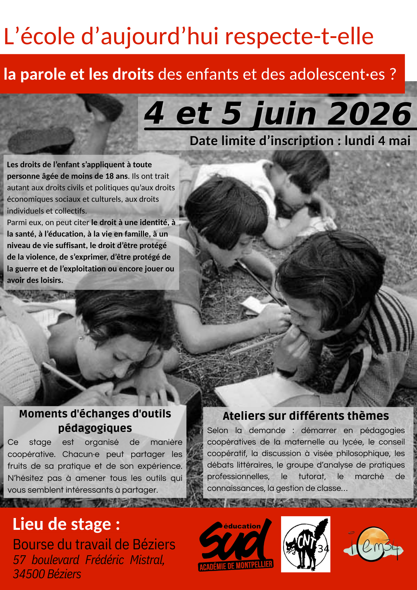SUD éducation académie de Montpellier, la CNT-ESS34 et l’ICEM34 organisent un stage académique de formation syndicale et pédagogique sur le thème : « L’école aujourd’hui respecte-t-elle la parole et les droits des enfants et des adolescent·es ?  ». Les jeudi 4 et vendredi 5 juin 2026 à la bourse du travail de Béziers (57 Boulevard Lire plus …